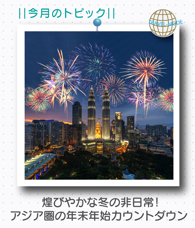 2025年10月25日 category:Travel-Mode今月のTRAVEL-MODEは、特別な年末年始を過ごしてみたい方に向けて、近場のアジア・カウントダウン情報をお送りします。お伝えする都市は、いずれも世界が認めた熱い祝賀会場!補足として、編集部だよりでアジア諸国の旧正月についても掲載しています。併せて旅の計画にお役立てください。そして今月の『街角動画』は、スリランカの世界遺産「シギリヤ・ロック」をお送りします。断崖絶壁!一生に一度は体験してみたいスリルあふれる登頂と360°緑色の絶景をお楽しみください。