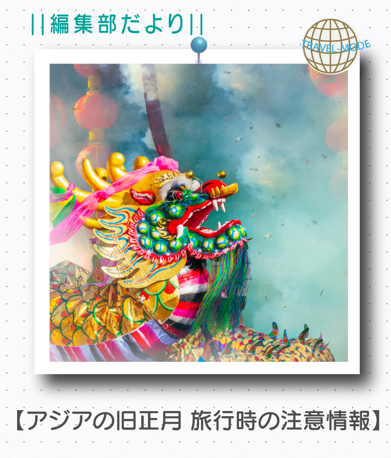 特集補足情報 アジア諸国では旧正月も盛大に行われます。特別なイベントもありますので、調べておくと旅行がさらに楽しくなるでしょう。ただし、混雑したり、ショップやレストランの営業時間が異なることがありますので、日程の選び方や滞在時に注意が必要です。旧正月には、人の移動が多く混雑します。航空券やツアーの予約は早めに手配をしましょう。 |